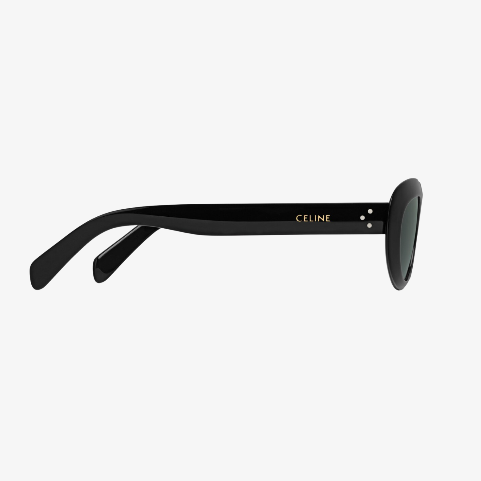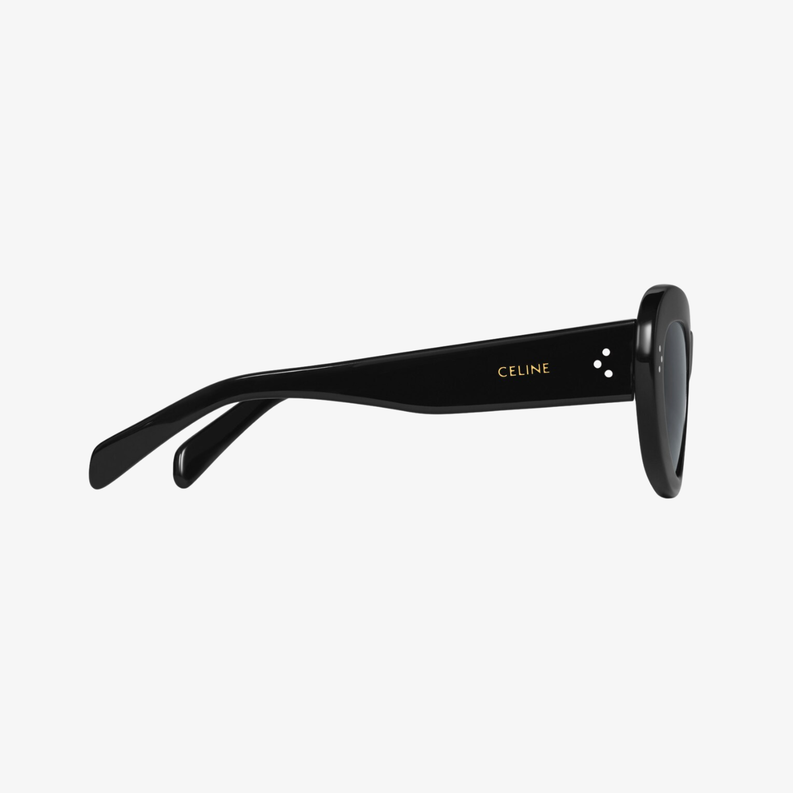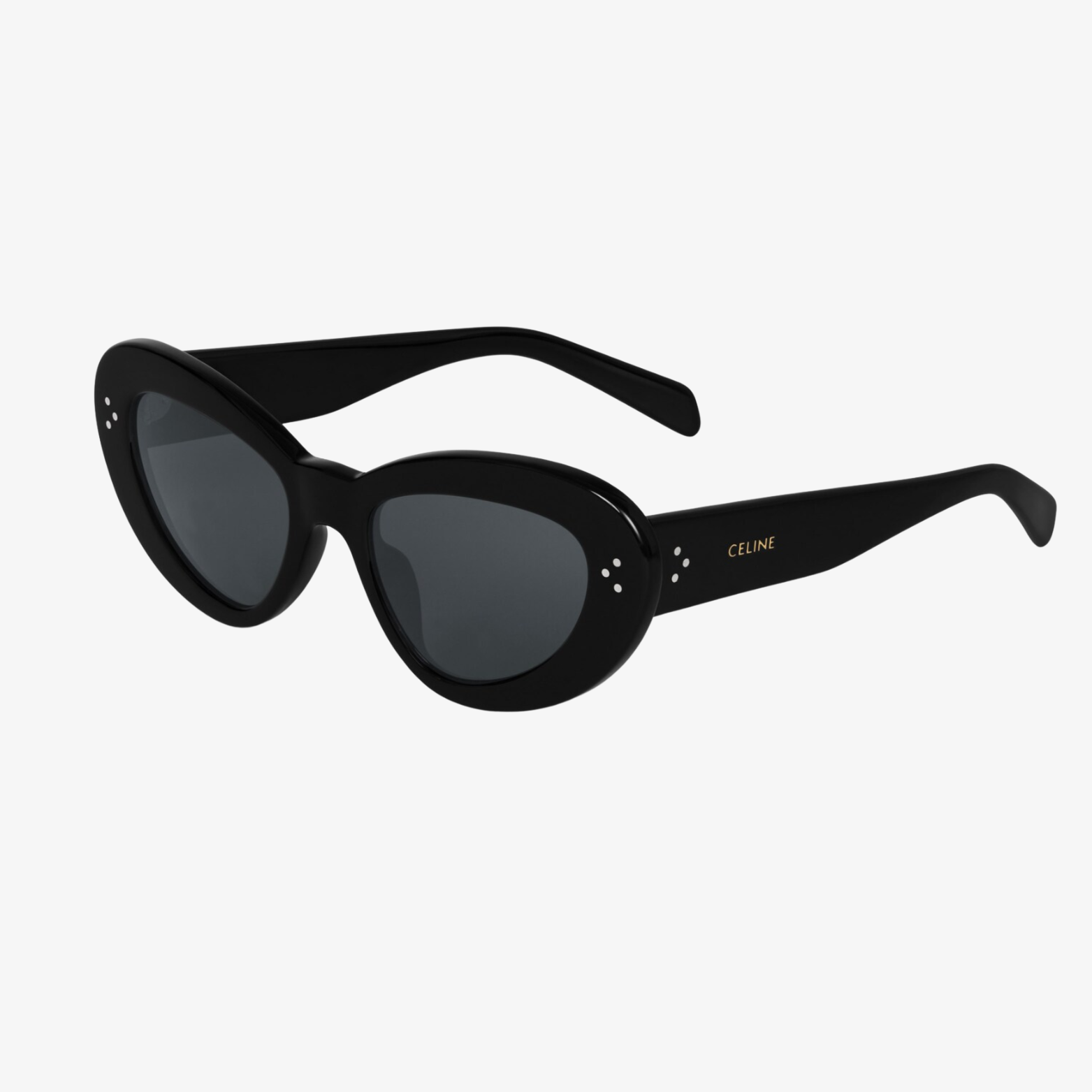 TEMPLE LENGTH 5.7 IN LENS WIDTH 2.1 IN NOSE BRIDGE LENGTH 0.7 Acetate Frame Cat Eye Frame Smoke Lenses Protects from UVA and UVB 3 DOTS AND CELINE SIGNATURE ON TEMPLES