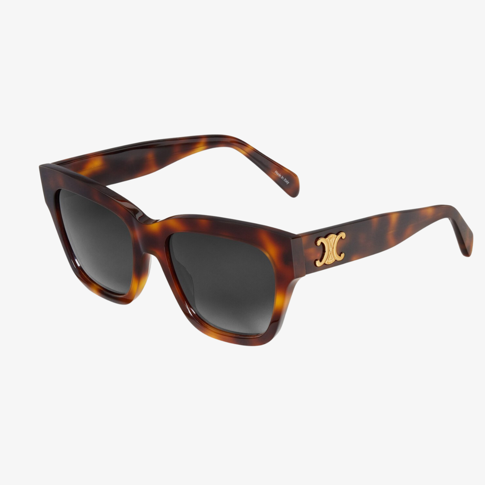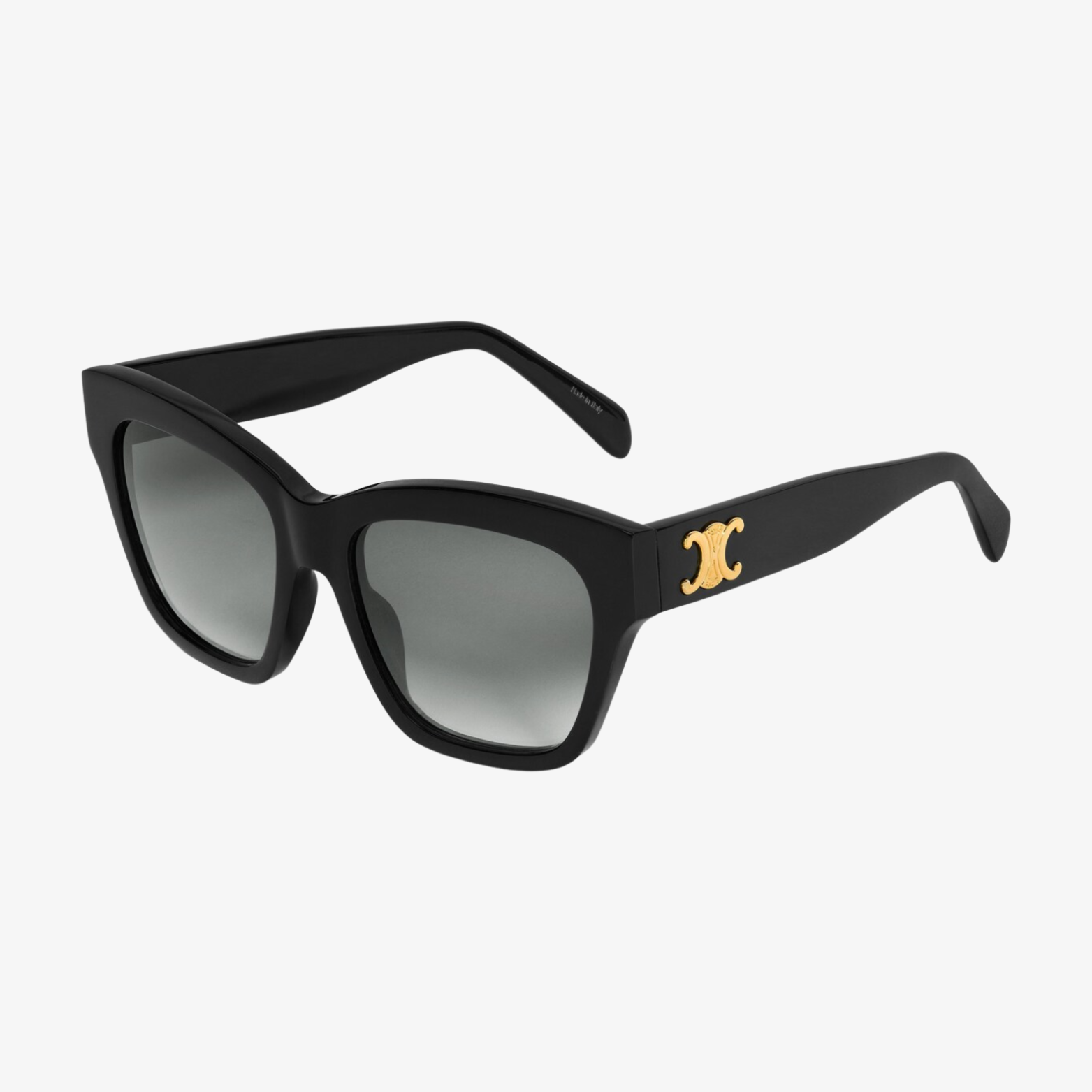 TEMPLE LENGTH 5.5 IN LENS WIDTH 2.2 IN NOSE BRIDGE LENGTH 0.7 IN Acetate Frame Cat Eye Frame Gradient Smoke Lenses Protects from UVA and UVB Triomphe Signature on temples