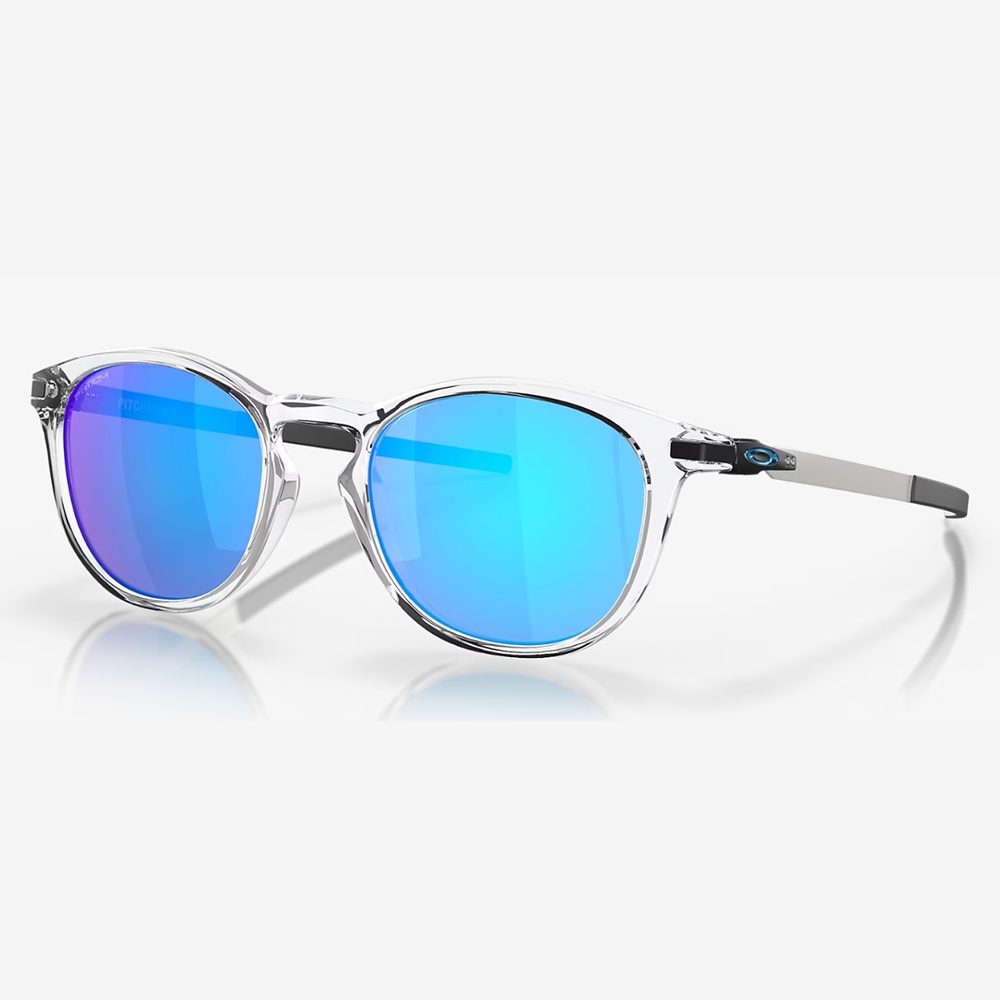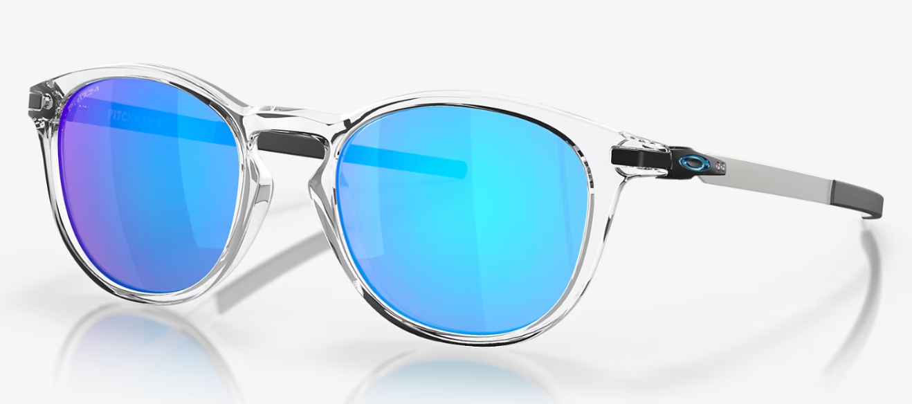 Model : OO9439 Pitchman™ R Shape: Round Frame material: O_matter Frame colour: Polished Clear Lens material: Polycarbonate Lens Technology: Prizm Lens color: Prizm Sapphire Lens height: 42.5